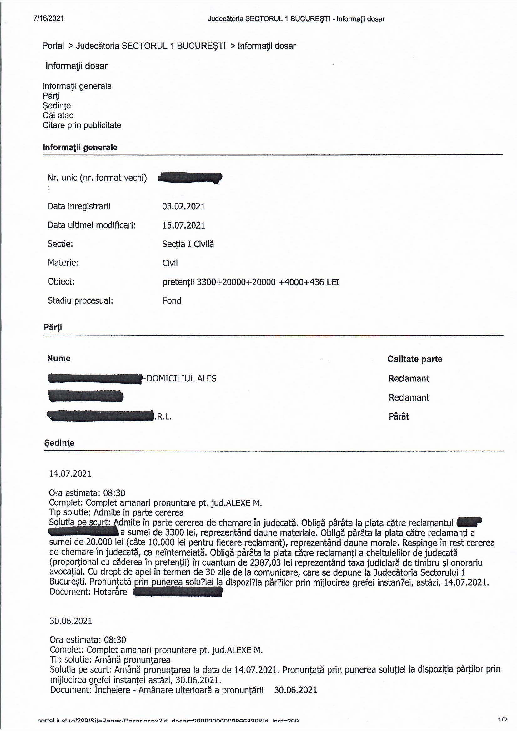 În mod subsecvent, două dintre persoanele anchetate abuziv au apelat la avocat Galan Alex din Constanța pentru a obține de la adversar daune materiale și morale. Procesul a avut loc la Judecătoria Sectr 1 București și a fost câștigat, prin obligarea la plata de daune morale și materiale substanțiale.