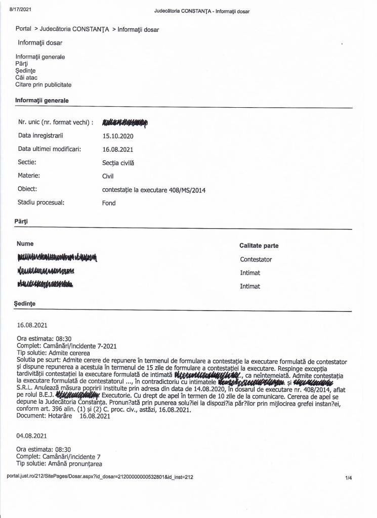Pe fondul cauzei s-a obținut anularea popririi pentru argumentul prescripției, întrucât firma de recuperare a lăsat dosarul în nelucrare timp de mai mult de 3 ani, fără a face nici un act de executare silită.